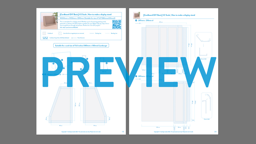 This is a template for a display stand. Whether you're showcasing greeting cards, postcards, or photos, this DIY project is perfect for you! Watch step-by-step instruc- tions to guide you through the process. Perfect for a fun DIY project!