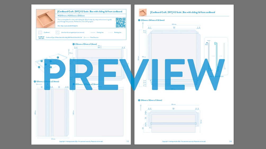 [Cardboard Crafts | DIY] A sliding lid box from cardboard 200mmx200mmx50mm : A4 Printable 1/2 Scale Template